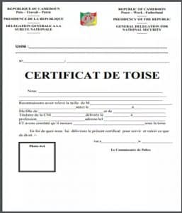 - Certificat de toise certifié, à faire également au poste de police (timbre de 500 F CFA obligatoire). Ce document peut être téléchargé sur internet : tapez simplement « Certificat of toise Cameroon » dans votre moteur de recherche.