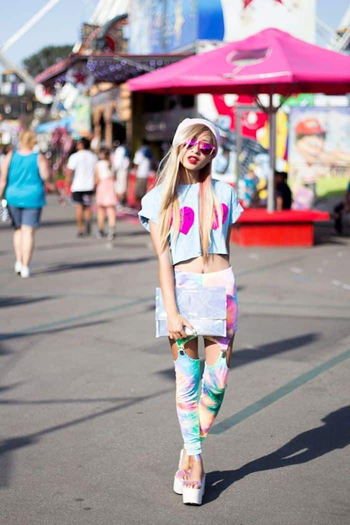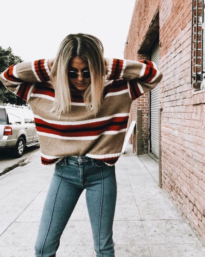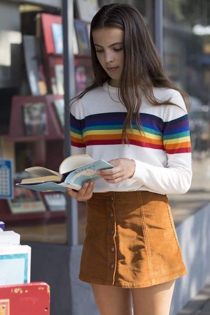 Mini jupe trapèze et pull arc-en-ciel – idée cool comment habiller pour une soirée des années 80