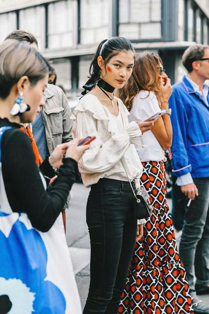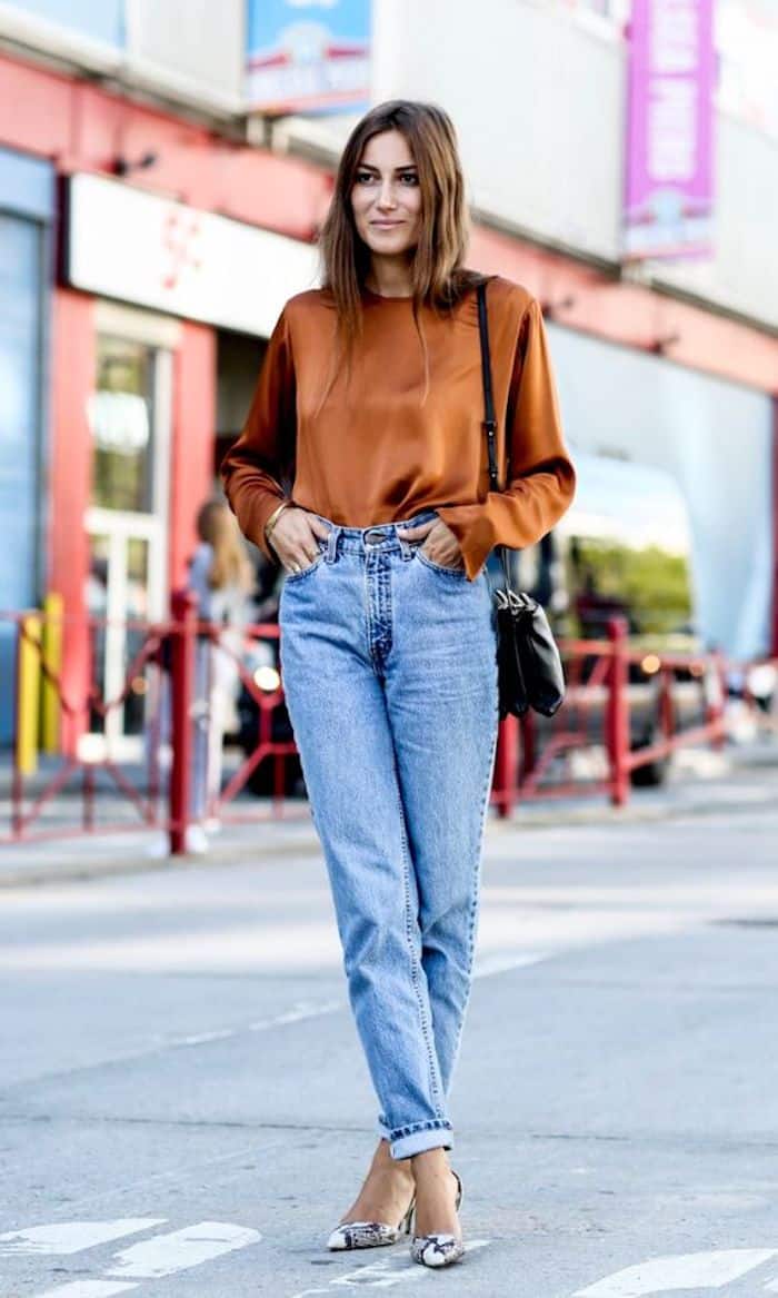 Bonne idée de s’habiller pour une soirée de 80 ans — jean noir avec taille haute et chemise originale à col rond accessoirisé