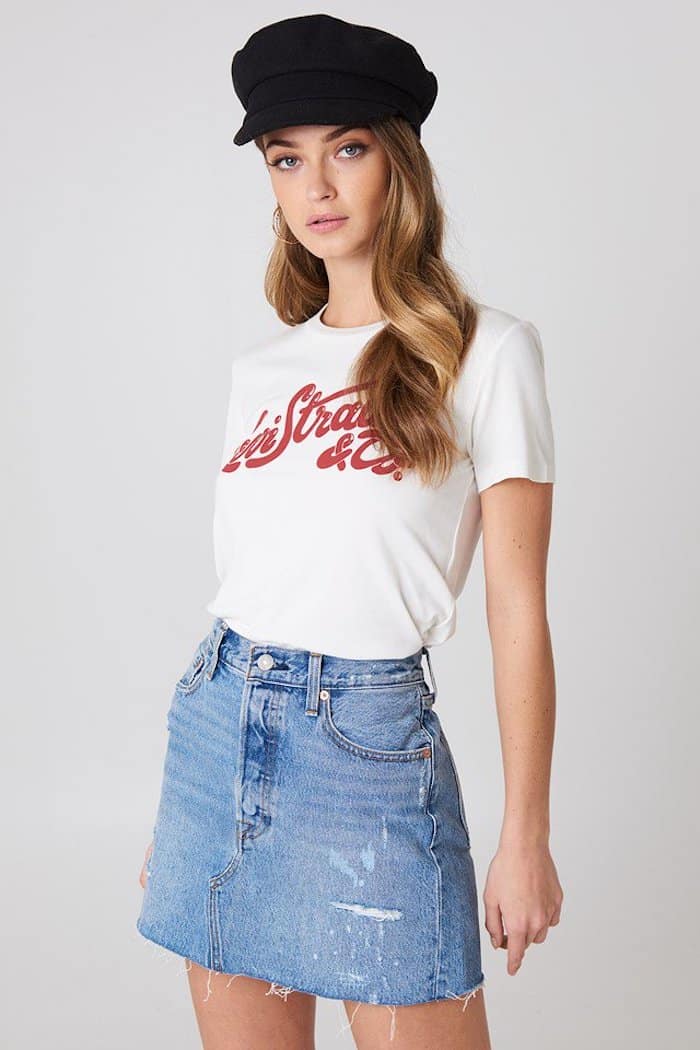 T-shirt imprimé Mickey Mouse, jeans maman et manteau long – excellente idée comment habiller dans l’esprit des années 80