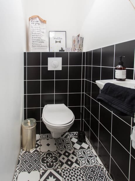 Leroy Merlin Le duo noir et blanc fonctionne aussi sans lumière naturelle, à condition de bien doser. On évite la symétrie stricte : des murs latéraux blancs associés à un mur noir en face de la porte, par exemple, donnent du rythme à l’espace. Pour le sol, un carrelage motif carreaux de ciment ou damier ajoute une note de fantaisie bienvenue.