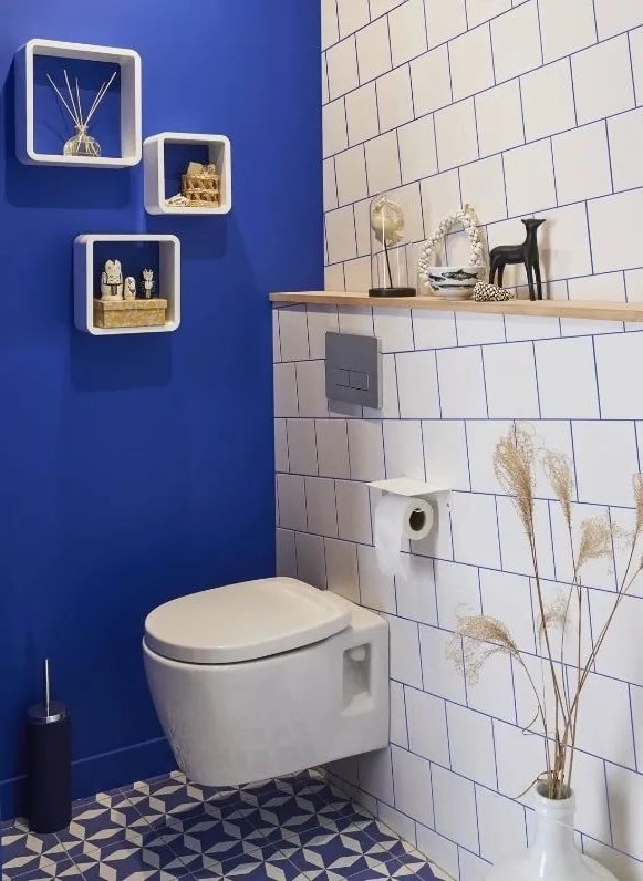 Leroy Merlin Le bleu Klein, profond et éclatant, prend toute sa dimension associé à un blanc pur. Ce contraste apporte une luminosité inattendue et affirme le style de la pièce. Les joints colorés ajoutent une touche artistique originale à cet espace souvent négligé.