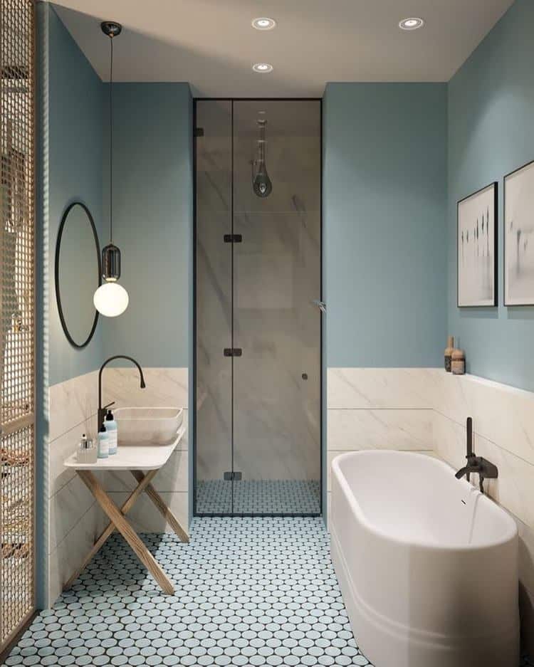 Pour fixer la bonne hauteur, il peut être utile de s’appuyer sur d’autres éléments architecturaux de la salle de bain. La porte, par exemple, sert souvent de référence. Le bord supérieur des carreaux peut aussi s’aligner sur la moitié de la fenêtre, ou sur un quart de la hauteur du miroir au-dessus du lavabo. Dans une salle de bains mansardée, le mur en pente devient un guide tout trouvé pour déterminer où s’arrêter. L’objectif : trouver un équilibre entre contraintes techniques et esthétique d’ensemble.